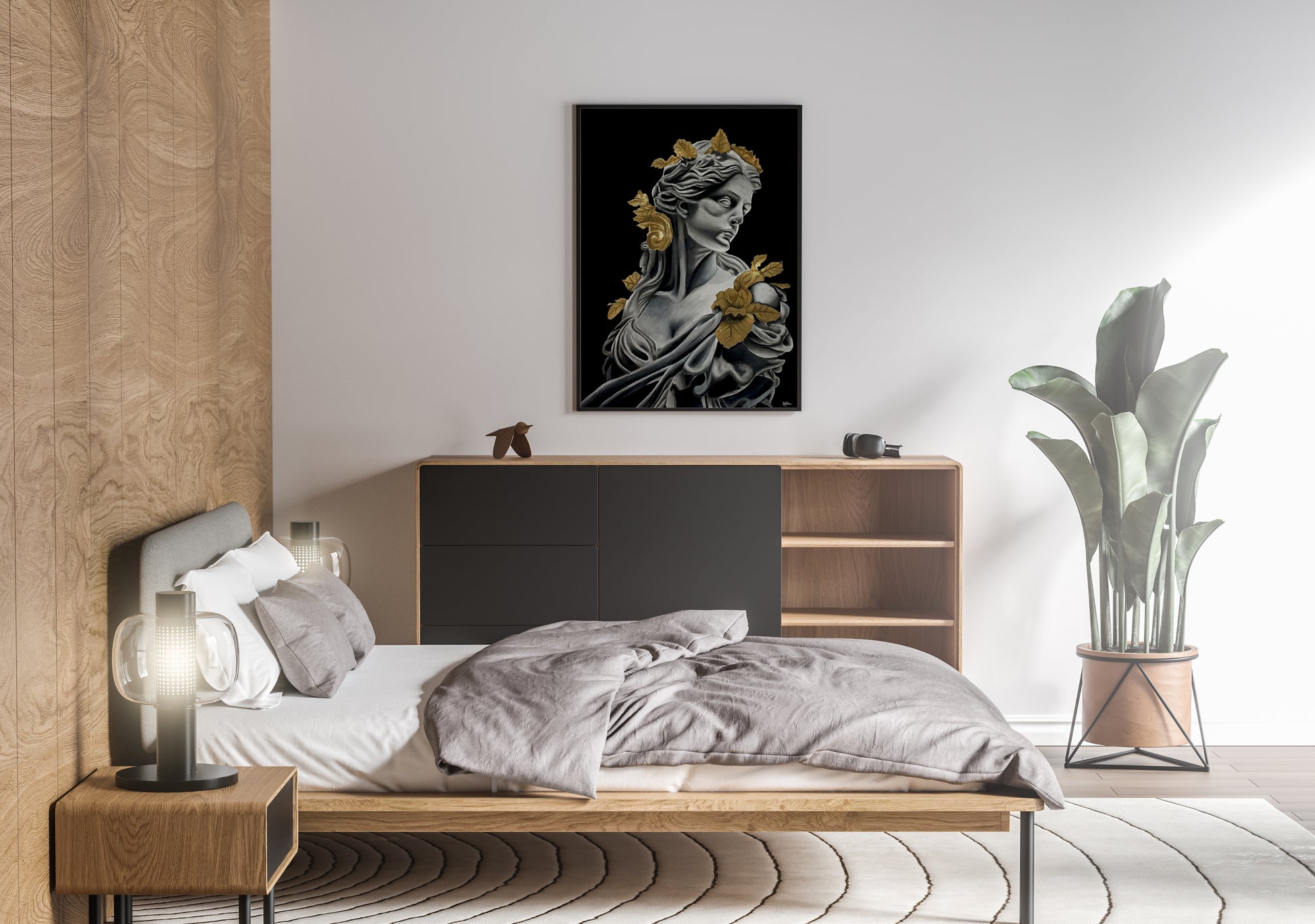 "Golden roots, marble beauty" is a graceful and powerful portrait of a woman who feels both timeless and eternal. Painted in soft black, white, and grey tones, her calm expression and sculpted features resemble carved marble.