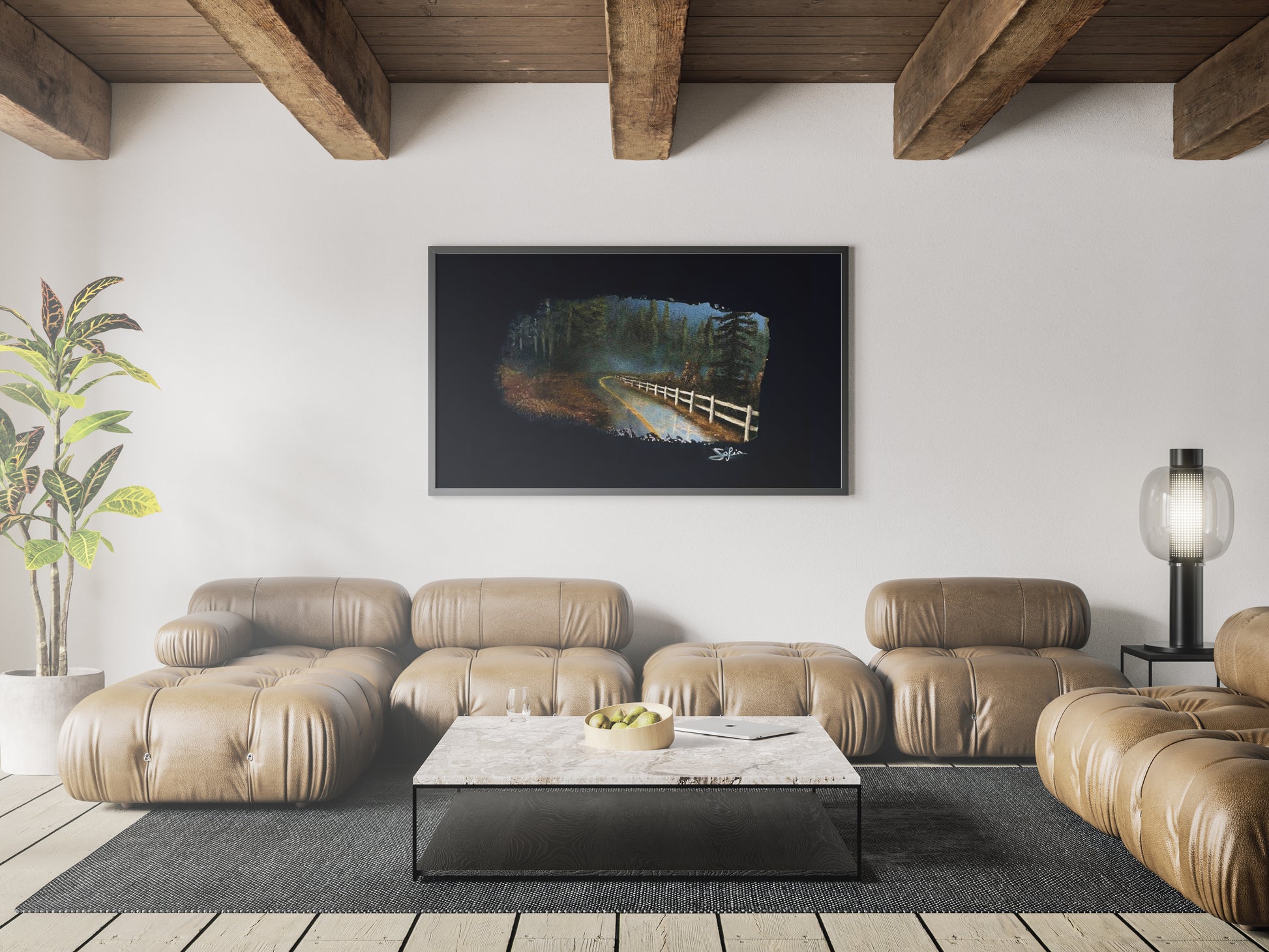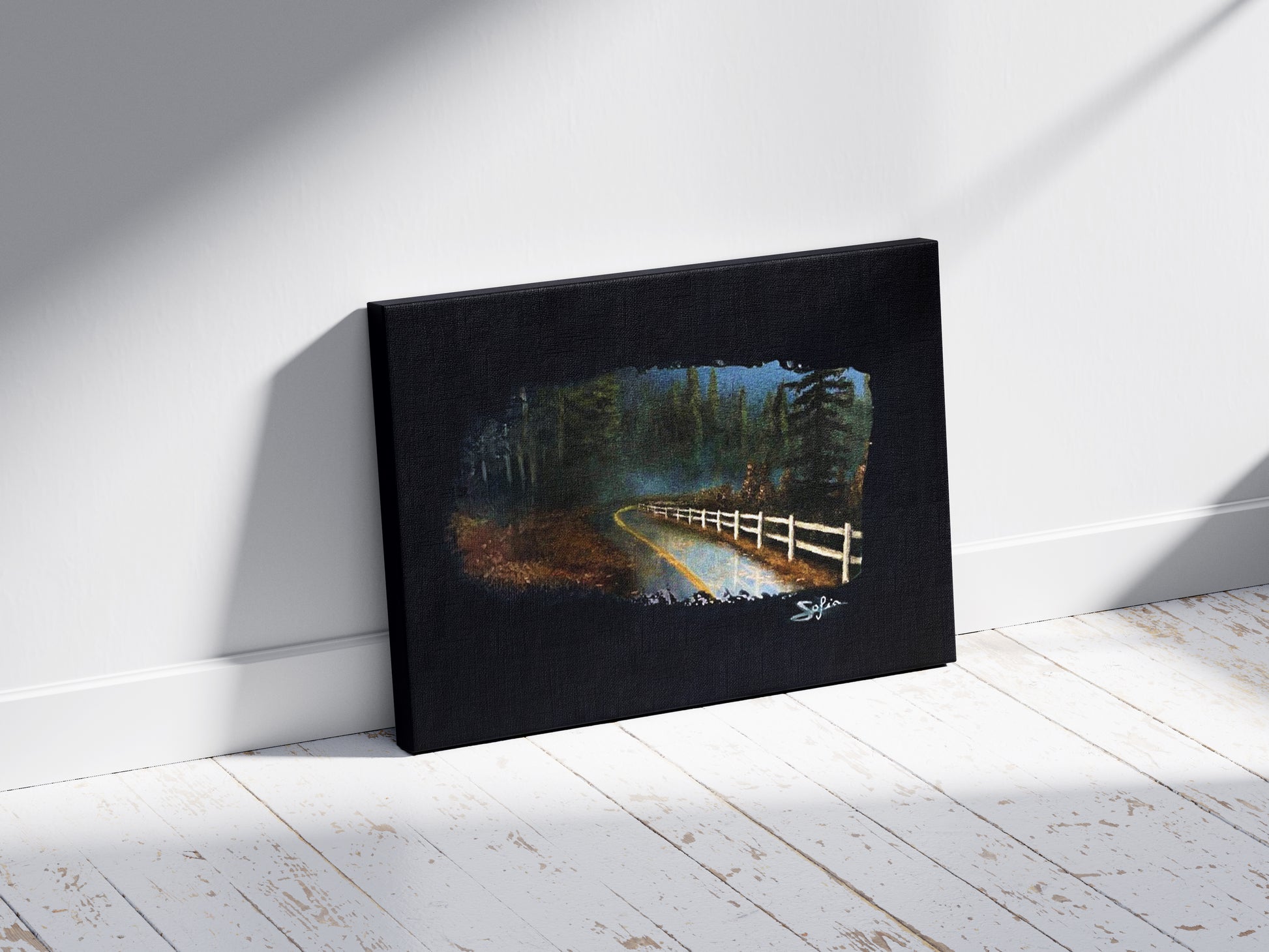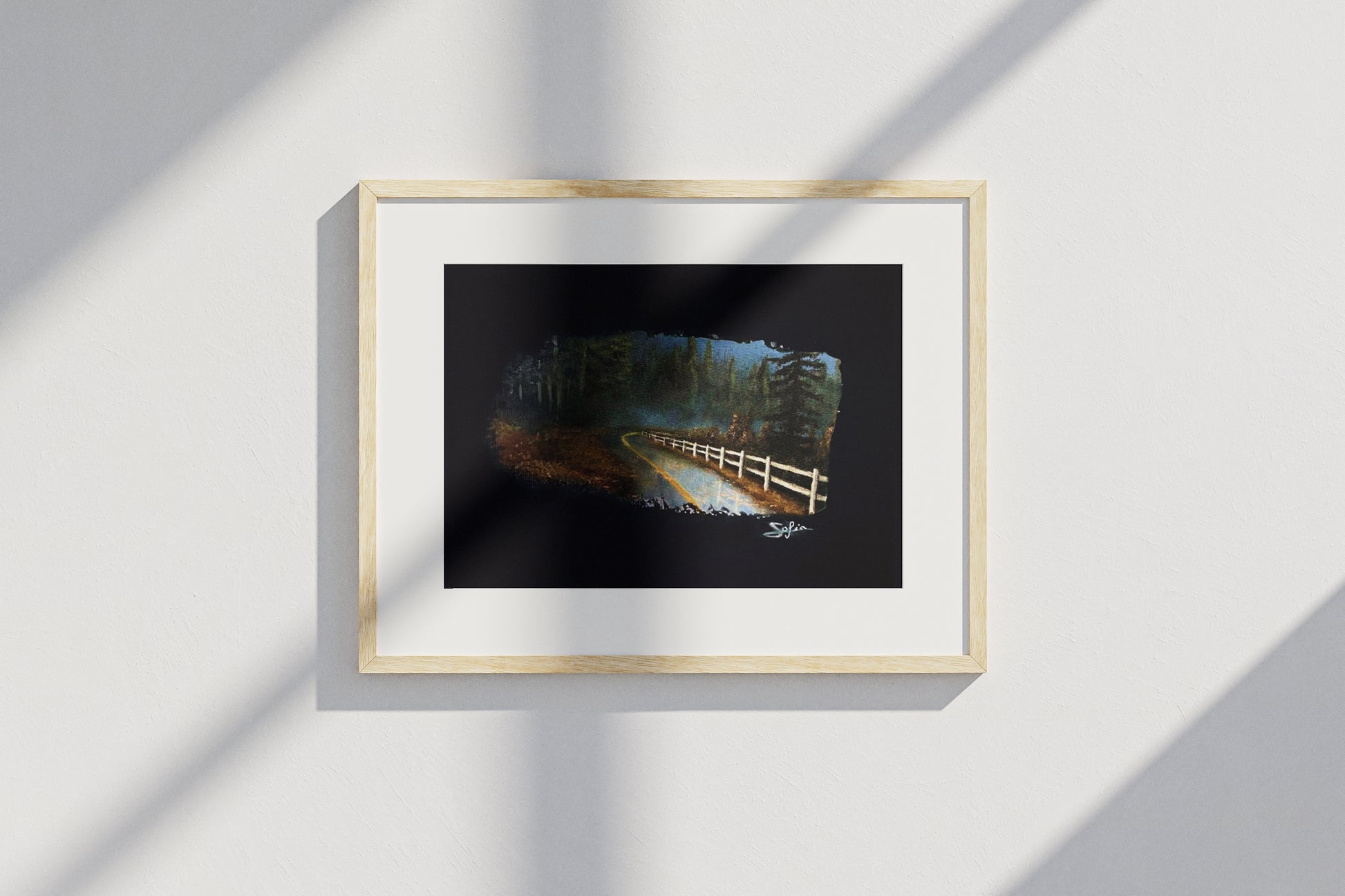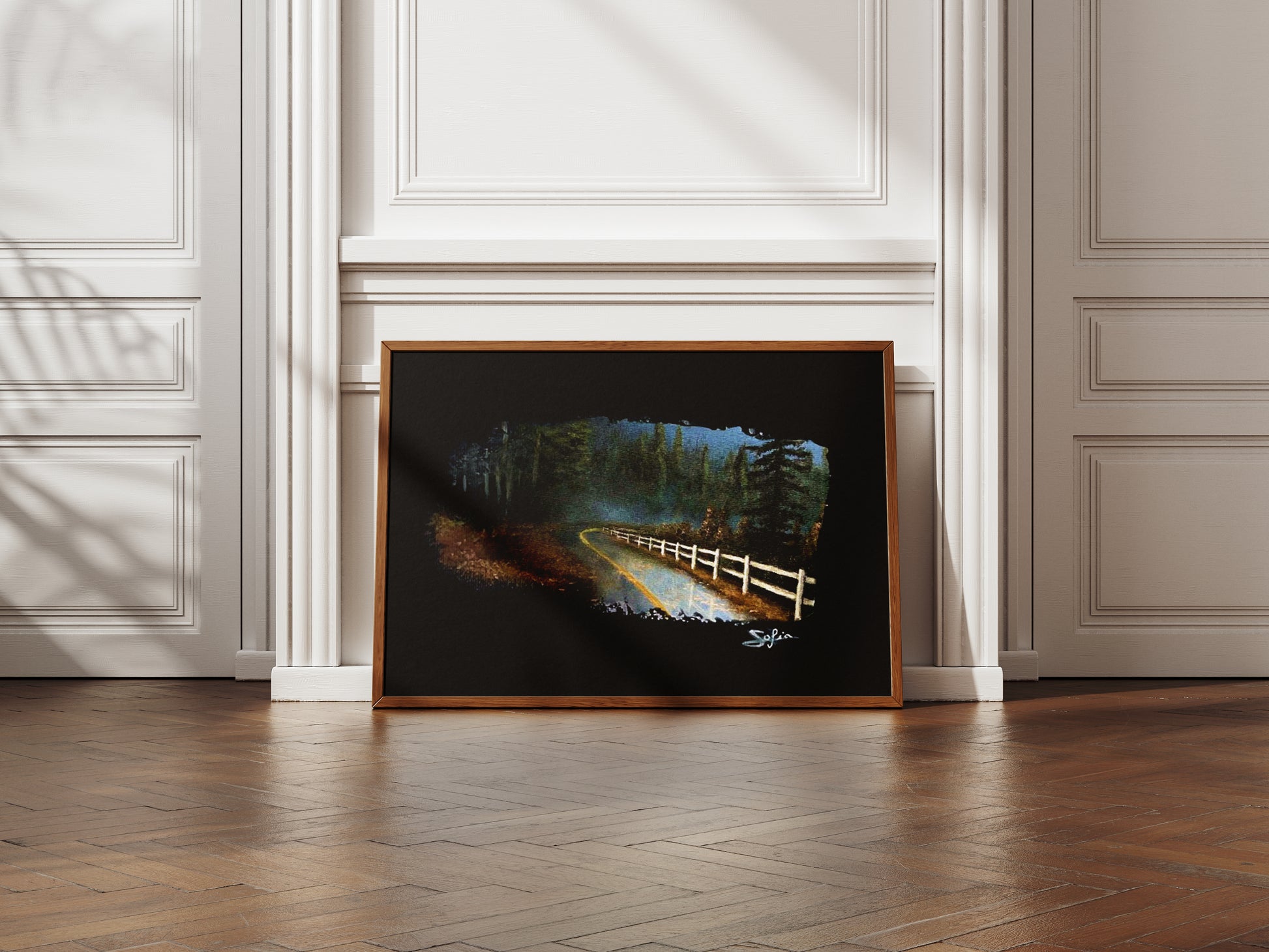 "Where the road remembers" is an acrylic painting that captures a quiet, mysterious scene. A wet road winds through a dark forest, reflecting the light after a rainfall. A simple white fence follows the curve, leading the way into the distance. The trees are covered in mist, making the forest look deep and endless. The painting is framed by black, making it feel like you're looking through a window into another world. The soft glow on the road and the peaceful atmosphere give a sense of calm, solitude, and wonder.